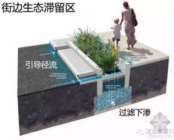 和雨水花園具有相同功能的措施還有生態(tài)滯留區(qū)。但較前者不同的是,生態(tài)滯留區(qū)土壤對(duì)于工程技術(shù)要求相當(dāng)嚴(yán)格,對(duì)于土壤和工程排水結(jié)構(gòu)也都有明確的要求,并且根據(jù)位置的不同可分為生態(tài)滯留帶、生態(tài)樹池、生態(tài)滯留池等。如同下圖街邊生態(tài)滯留區(qū),通過(guò)對(duì)街豁口將路面徑流引流至收水區(qū)進(jìn)行蓄留。